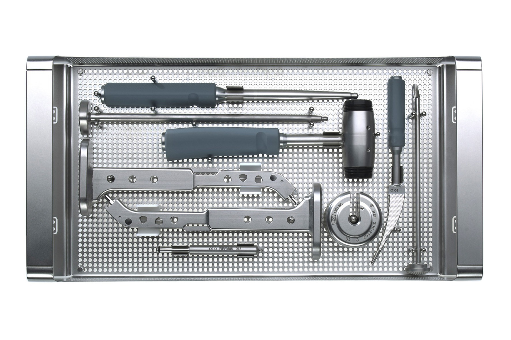 Finally, secondary anchorage is achieved by osteointegration, which is favored by used titanium alloy and the surface roughness. All implant variants of the SPC hip stem can be inserted using the same instrumentation and surgical technique. Various test cones with the corresponding angles are available for the modular rasps, which are used for intraoperative trial positioning and thus to confirm the implant size and variant selected pre-operatively.